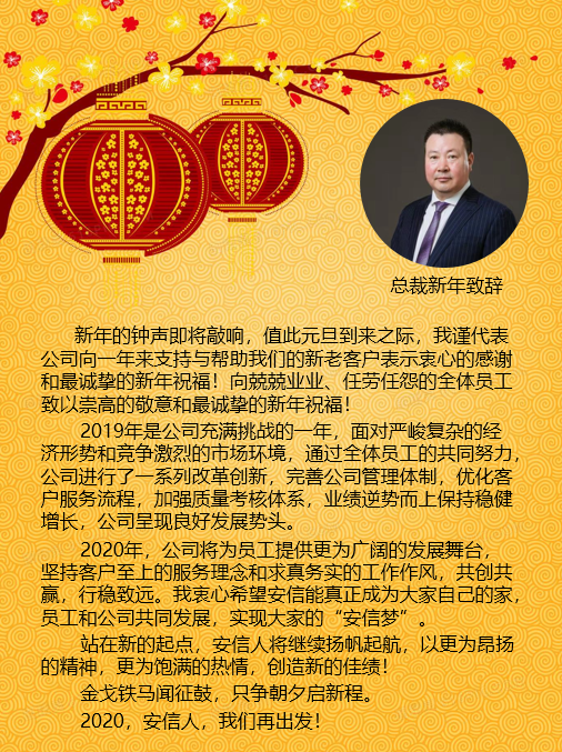 2020年,公司将为员工提供更为广阔的发展舞台,坚持客户至上的服务理念和求真务实的工作作风,共创共赢,行稳致远。我衷心希望安信能真正成为大家自己的家,员工和公司共同发展,实现大家的“安信梦”。